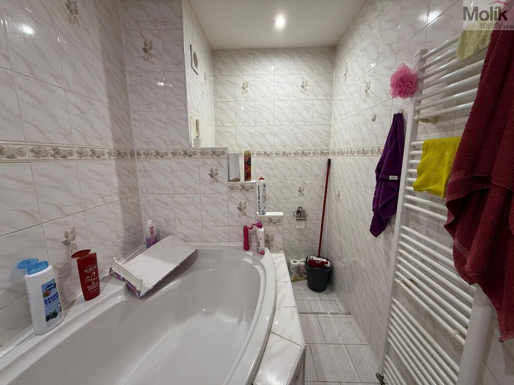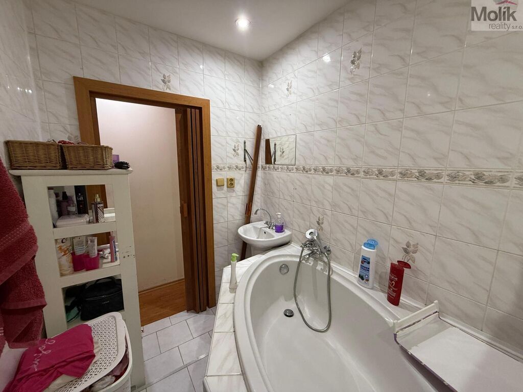 Dispozice bytu zahrnuje předsíň, kuchyně, obývací pokoj, dva pokoje, koupelnu s rohovou vanou a WC. V bytě zůstává vybavená ložnice a bílá skříň v dětském pokoji.