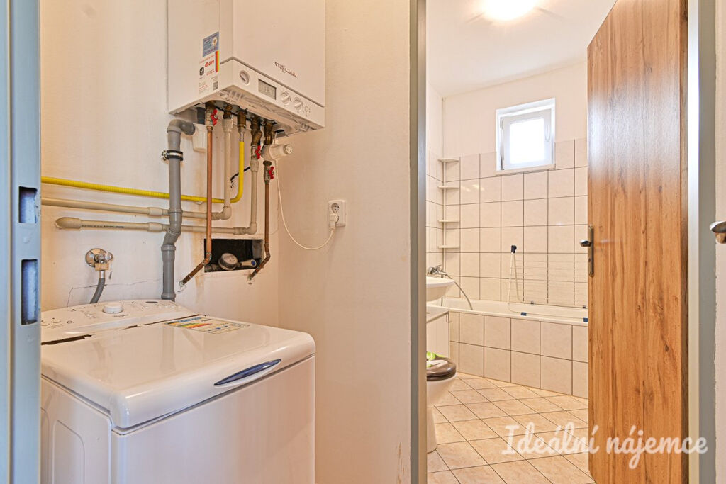 Byt se nabízí téměř bez vybavení. Koupelna disponuje vanou, umyvadlem se skříňkou, pračkou a toaletou.