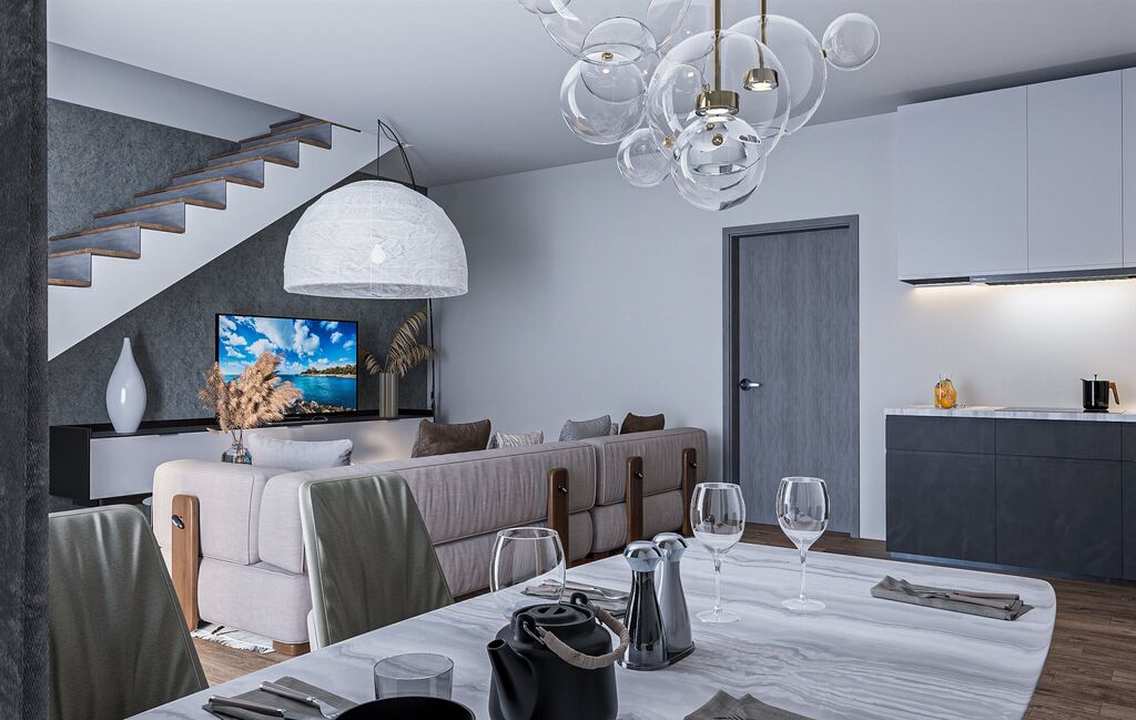 Prostorný a světlý obývací pokoj s kuchyňským koutem, přípravou pro krb a velkým francouzským oknem na terasu s výhledem na zahradu – ideální místo pro ranní kávu.
