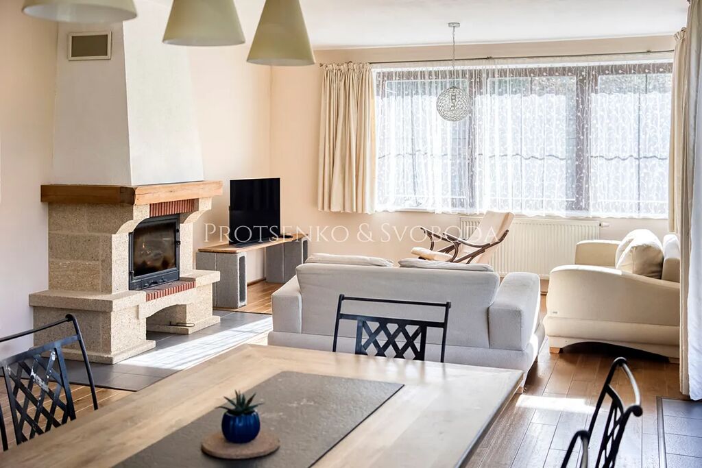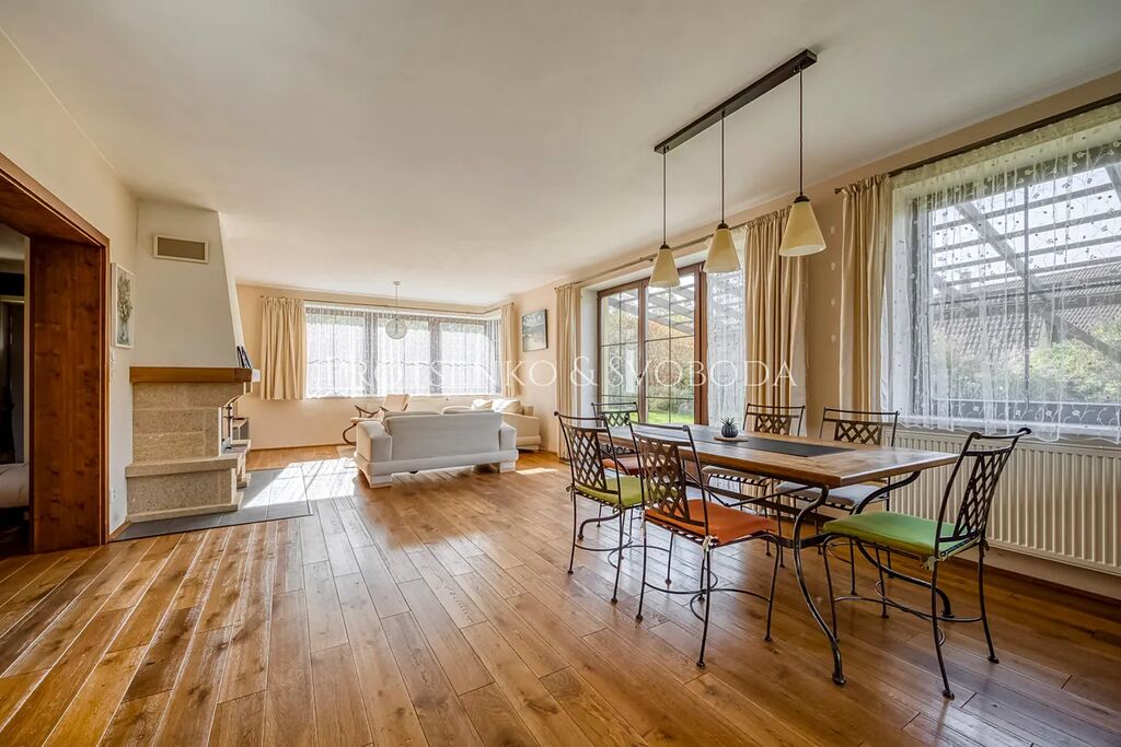 - Přízemí tvoří prostorný obývací pokoj s krbem, propojený s jídelnou a kuchyní s přímým vstupem na zahradu a terasové posezení.