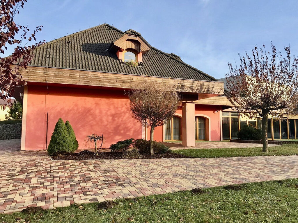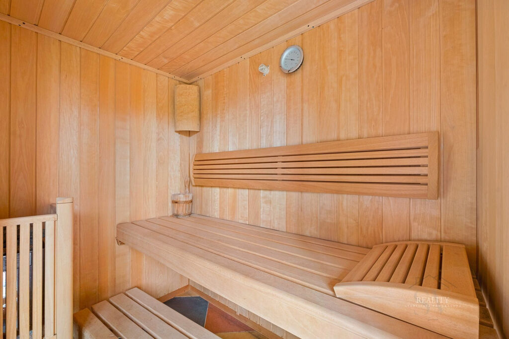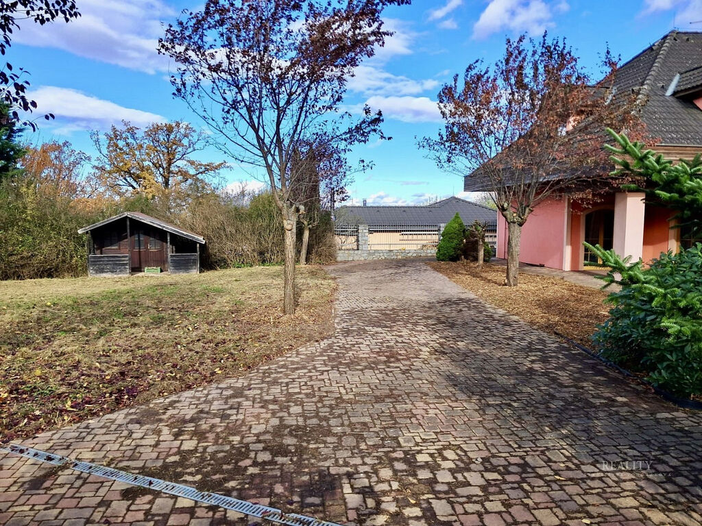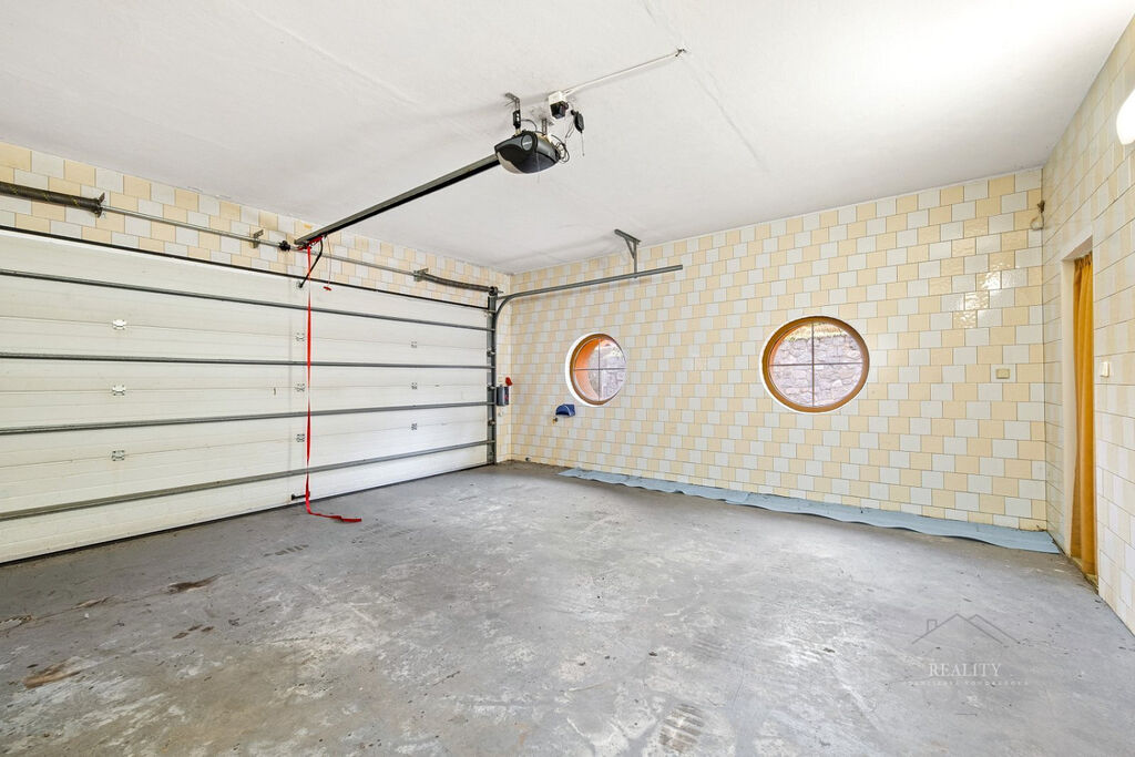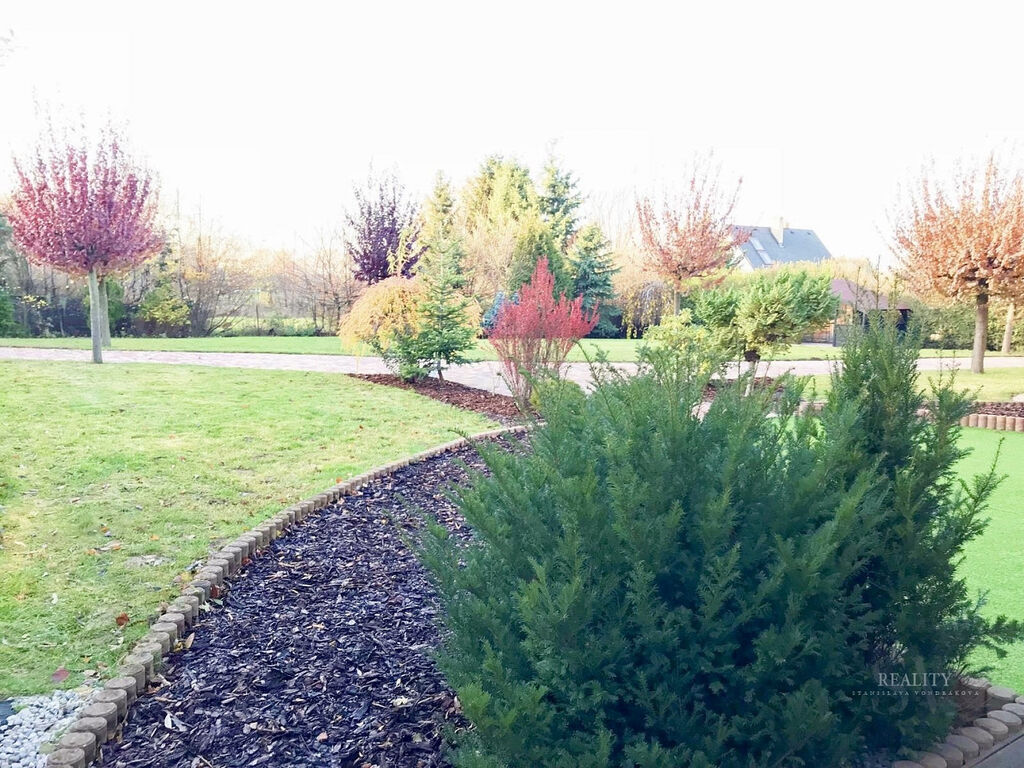 Wellness plocha není započtena do uvedené užitné plochy domu – uváděna zvlášť, přímý vstup z domu do wellness zóny a na nádherně členitou zahradu o 1 738 m² s okrasnými dřevinami, trávníky a odpočinkovými zákoutími, altán s velkým zděným grilem a posezením – ideální pro rodinné a společenské akce, elektrická brána, krytá garáž u vjezdu, dlážděné přístupové cesty po celém pozemku, francouzská okna a obloukové architektonické prvky zajišťující propojení s přírodou, vlastní studna (vhodná pro provoz a závlahu zahrady), technická místnost s technologií k bazénu, plynovým kotlem i kotlem na tuhá paliva