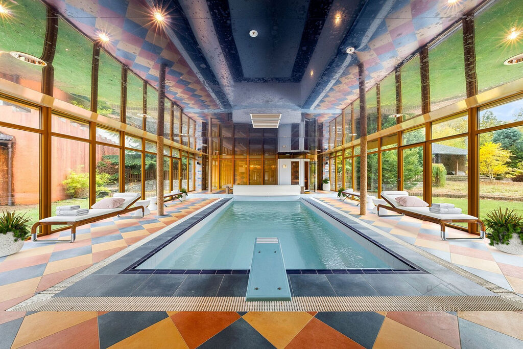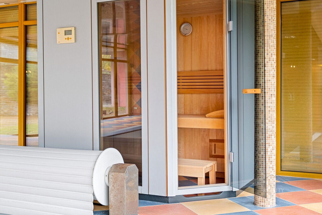 samostatná wellness hala 108 m² (krytý bazén s protiproudem 7,5x 3,5m², hl. 1,7 m, sauna, relaxační zóna)