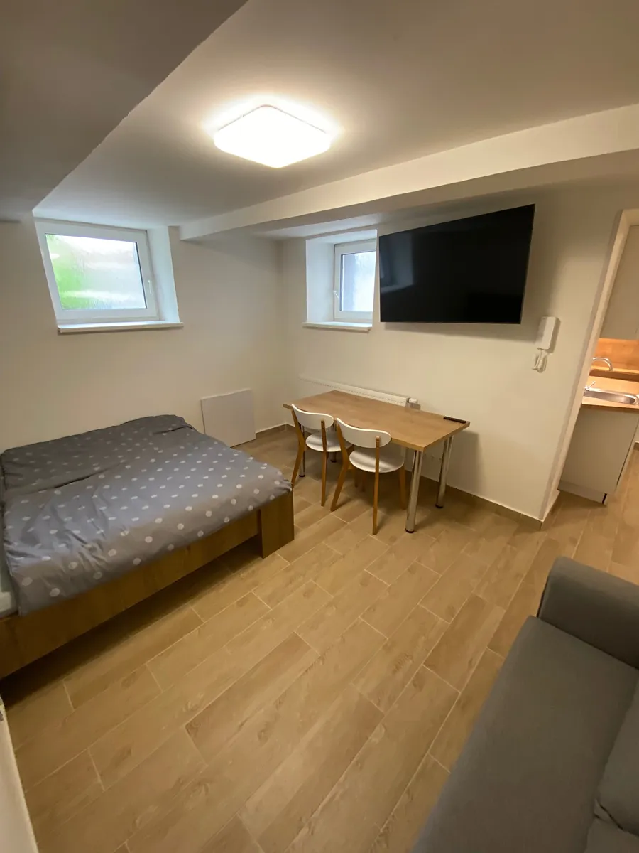 Dispozice a vybavení bytu: Kuchyňský kout se spotřebiči (lednice, varná deska, trouba, digestoř). Koupelna se sprchovým koutem a WC. Dále je v pokoji vestavěná skříň, stůl, 2 židle, pohovka, Smart TV Samsung a manželská postel s kvalitní matrací s polštářem, přikrývkou, plachtou a povlečením.