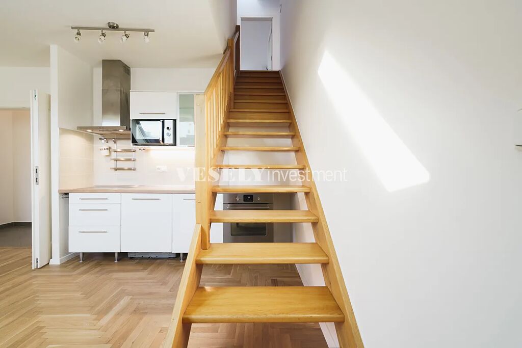 Interiér bytu je zhotoven z kvalitních materiálů, dubové schodiště a parkety, bezpečnostní vstupní dveře, podlaha na střešní terase ze sibiřského modřínu.