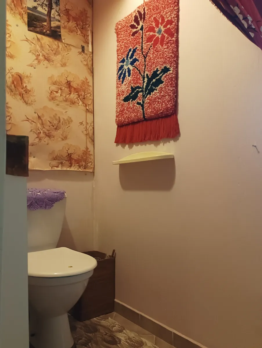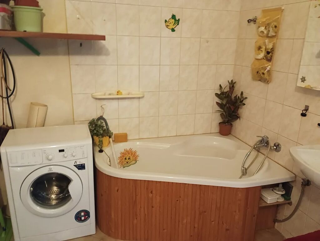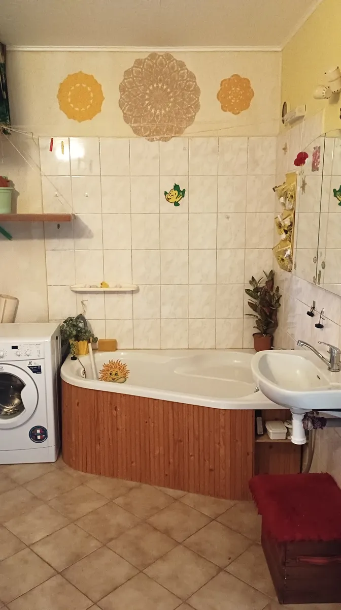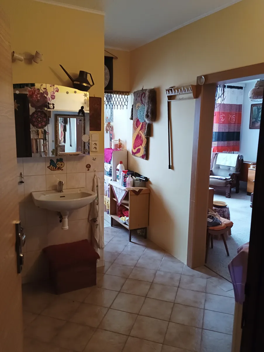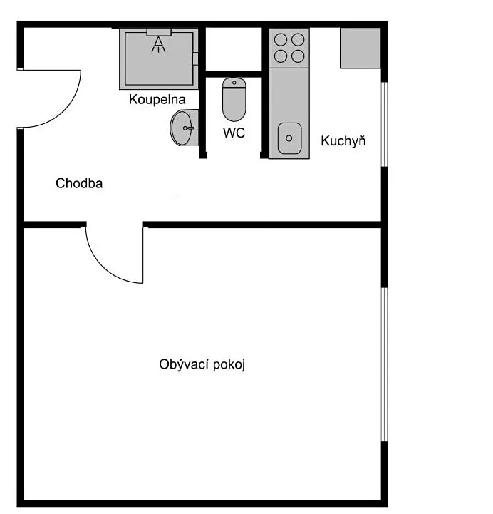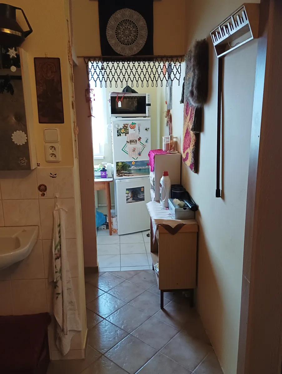 Při otevření vstupních dveří do bytu se nacházíte v předsíni s koupelnou, kde je instalována rohová vana. Z předsíně je vstup do kuchyně a obývacího pokoje.