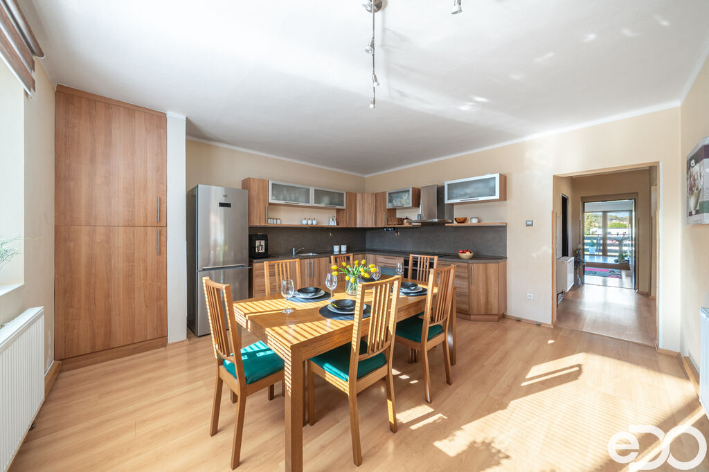 Dispozice domu zahrnuje prostorný obývací pokoj se vstupem na balkon, kuchyň s jídelní částí, 4 samostatné ložnice, koupelnu a samostatné WC. Možnost ponechání kompletního vybavení domu.