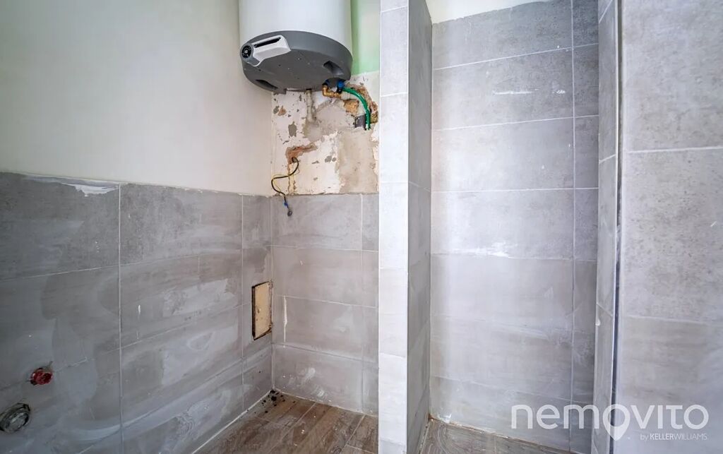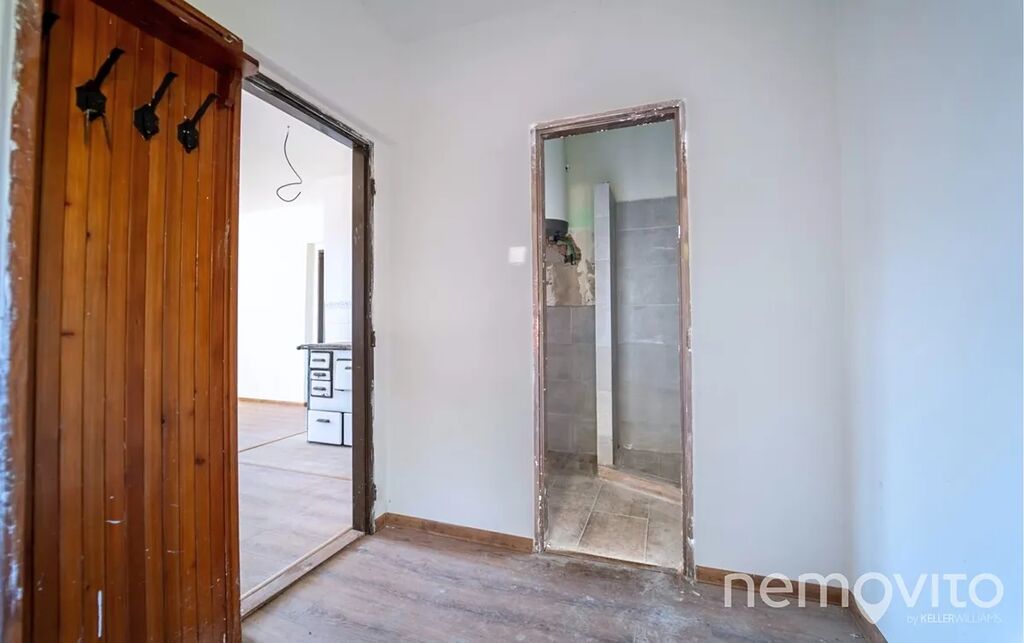 Započatá rekonstrukce zahrnuje částečné rozvody elektřiny, nové omítky, plovoucí podlahy a dřevěná okna. Koupelna je připravena pro instalaci zařizovacích předmětů.