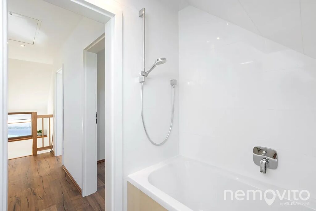 Byt je řešen ve dvou podlažích, přičemž zóna hlavní ložnice a dětí je oddělená. Rodiče tedy dole s vlastní šatnou i koupelnou, dětské ložnice s druhou koupelnou nahoře. Obývák je od kuchyně oddělený, linka je umístěná ve vstupní části bytu a k dispozici má také komoru/technickou místnost. Z hlediska úložných prostor je cenná také půda, která je přístupná z horní chodby.