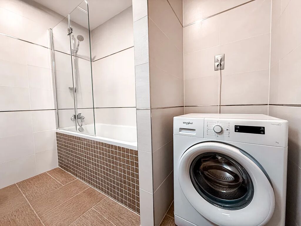 Dispozice zahrnuje obývací pokoj s plně vybavenou kuchyňskou linkou (trouba, varná deska, digestoř, myčka, lednice), ložnici, koupelnu s vanou a pračkou, samostatnou šatnu a prostornou terasu orientovanou do klidného vnitrobloku. Na terasu je přístup jak z obývacího pokoje, tak i z ložnice.