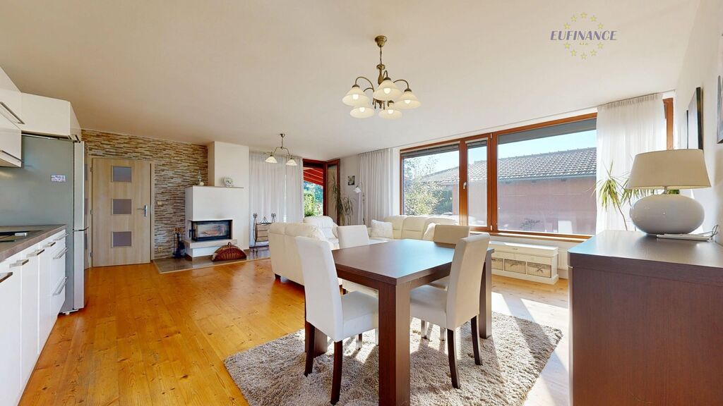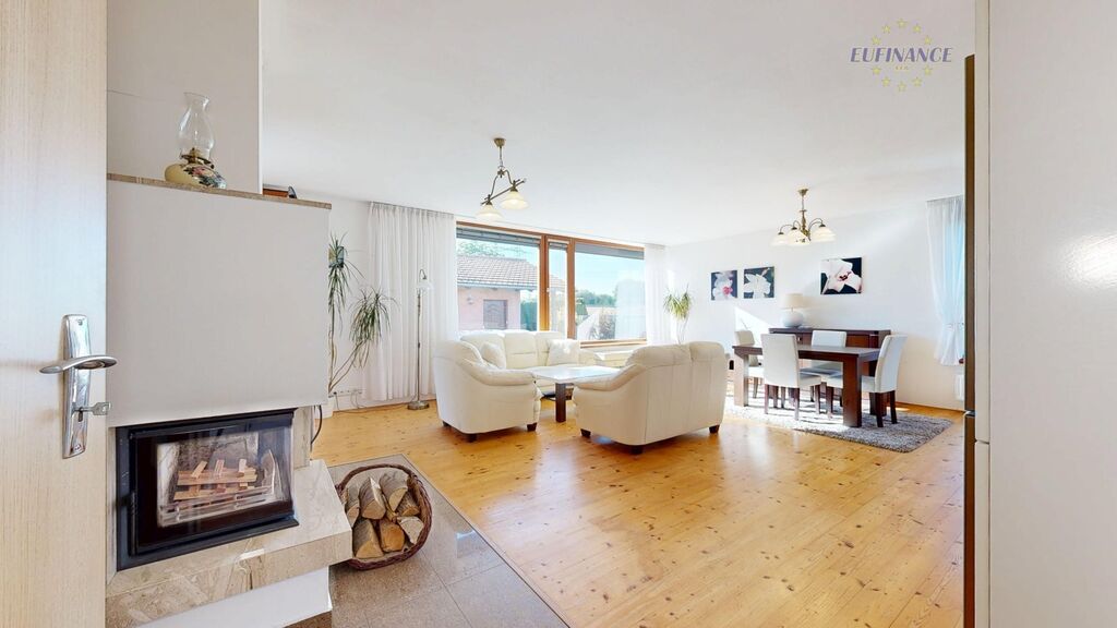 Dispozici domu je možné shlédnout ve virtuální prohlídce nebo v přiloženém půdoryse. Celé přízemí je prostorné a slunné. V celém domě jsou dřevěná euro okna s trojskly, ve všech pokojích elektronické venkovní rolety, krásné dubové podlahy a dlažba (technická místnost a koupelna). Rozvody elektřiny a topení jsou v mědi, voda v plastu. Celý dům je vytápěn úsporným elektro kotlem do radiátorů. V obývacím pokoji je dále k dispozici klimatizace a krb s kvalitní krbovou vložkou. Do domu jsou kromě plynu přivedeny veškeré inženýrské sítě (obecní vodovod a kanalizace, elektřina 230 a 380 V) vč. internetu. Na zahradě je k dispozici kopaná studna, která byla určena k napuštění bazénu, který se však nerealizoval. Veškeré vybavení domu i nábytek jsou součástí kupní cena.