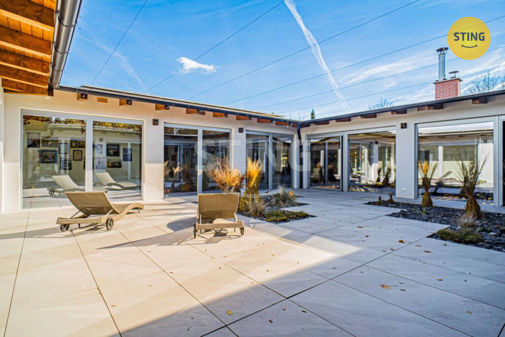 Uprostřed celého domu je umístěno nezastřešené atrium o rozměrech 9x10m. Za letních měsíců je výhled na otevřené nebe při zachování maximálního soukromí a bezpečí naprosto úžasný. Přes atrium je možné procházet skrze napříč celým domem a také samozřejmě k bazénu. V podlaze atria jsou dvě menší volné plochy, na kterých jsou osázeny okrasné trávy.