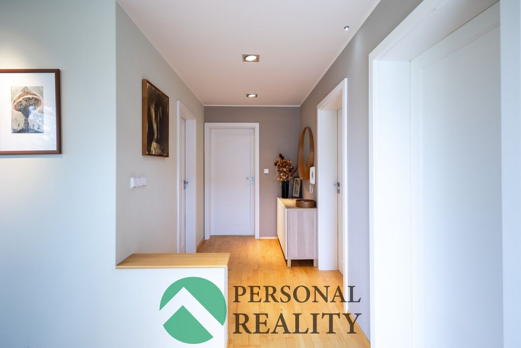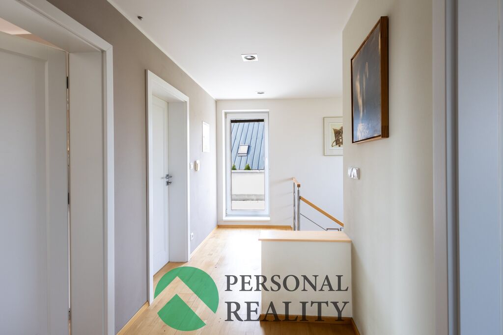 Horní patro: prosklená chodba, koupelna (WC, umyvadlo, vana a sprchový kout), dvě velké ložnice se šatnou, další samostatná místnost se vstupem na balkón a vstup na půdní prostor. Z oken horního patra je krásný výhled do okolí.