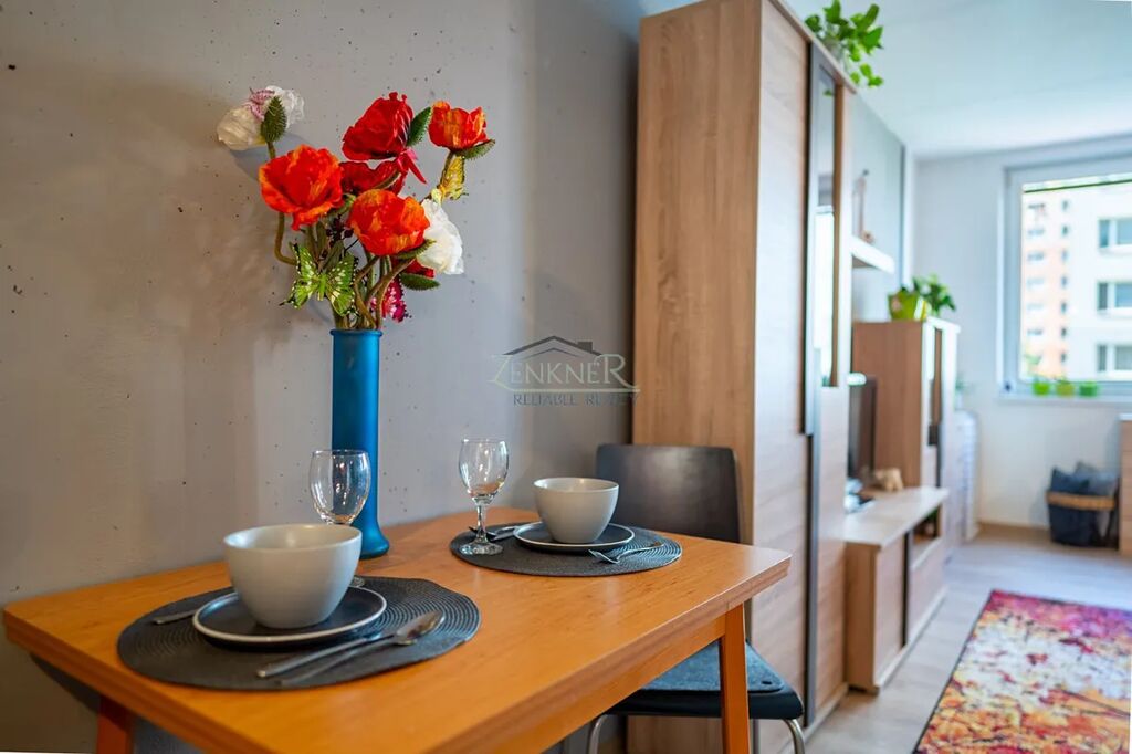 Byt je téměř plně vybavený – kuchyňská linka s elektrickým sporákem a digestoří, chladničkou, jídelní stůl s židlemi, obývací stěna, šatní skříně, manželská postel a noční stolky.