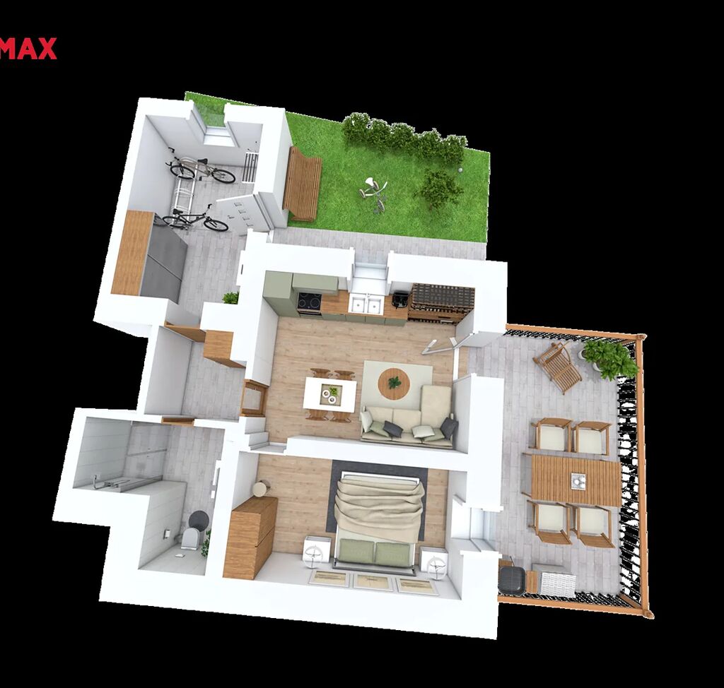 Dispozice tohoto apartmánu 2kk nacházejícího se v přízemí, jeho velká podlahová plocha a dobré členění, nabídne dostatečný komfort pro 4-5 osob. Tento apartmán má svůj vlastní vchod a bezbariérový přístup. Značným benefitem je velmi prostorná terasa pro příjemné posezení nebo grilování. K apartmánu je také ve výhradním užívání menší zahrádka. Za vstupními dveřmi budete mít k dispozici prostornou předsíň, kde můžete pohodlně vyskladnit veškeré své sportovní potřeby, a to klidně i 5 kol, které budete mít plně pod kontrolou.