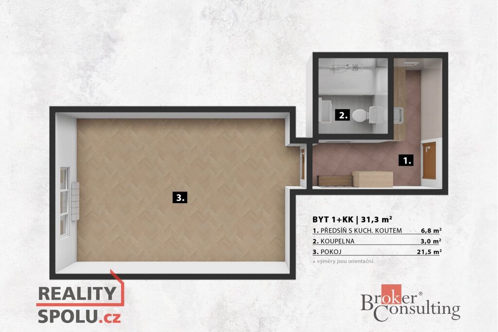 Dispozice 1+kk, podlahová plocha 31,3 m²