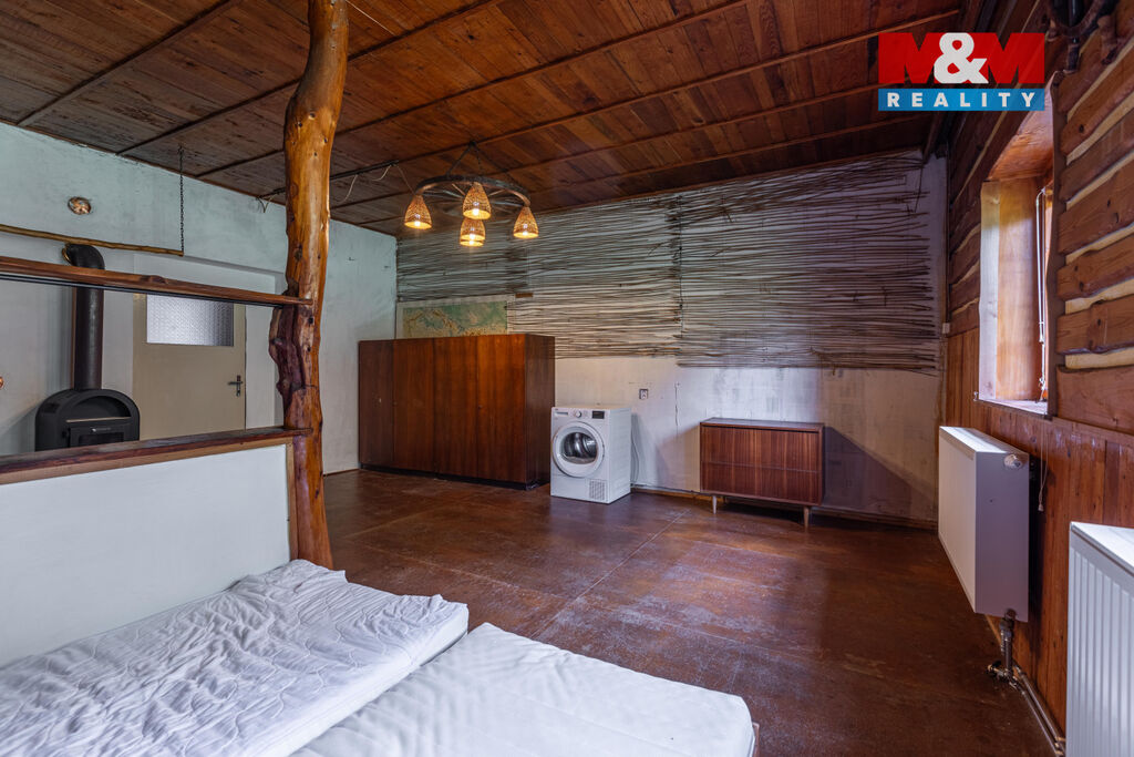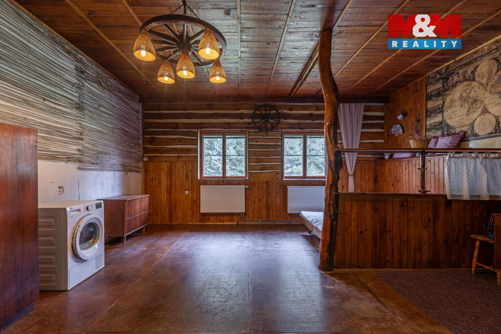 Chalupa má užitnou plochu 112 m² a působí velmi útulně. V přízemí najdete obývací část s možností vytápění krbovými kamny, kuchyni, ložnici a koupelnu. Podkroví nabízí možnost vytvořit další obytný prostor – pokoj pro hosty, ateliér nebo klidovou zónu pro sebe. Součástí je také dílna a praktické úložné prostory.
