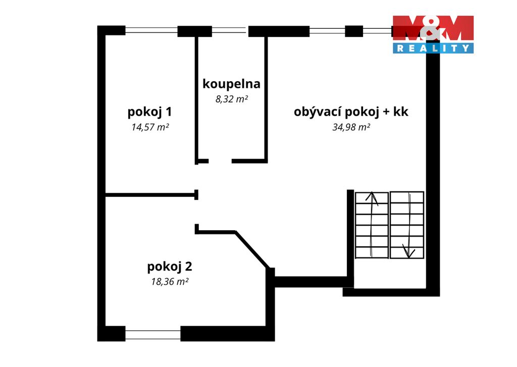 Celková podlahová plocha bytu je 91,83 m² a sestává z chodby (7,51 m²), obývacího pokoje s kuchyňským koutem (34,98 m²), pokoje (14,57 m²), druhého pokoje (18,36 m²) a koupelny (8,32 m²). Součástí bytu je balkon orientovaný do zahrady. K bytu dále náleží jedno parkovací stání a sklepní kóje.