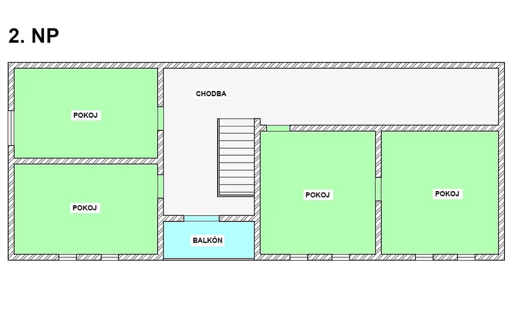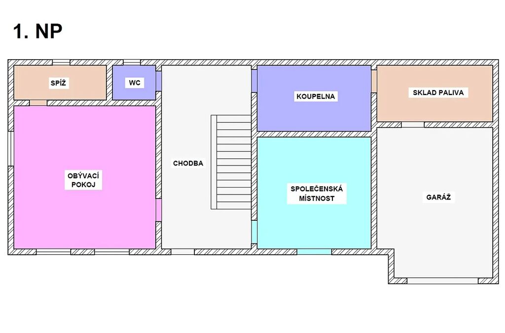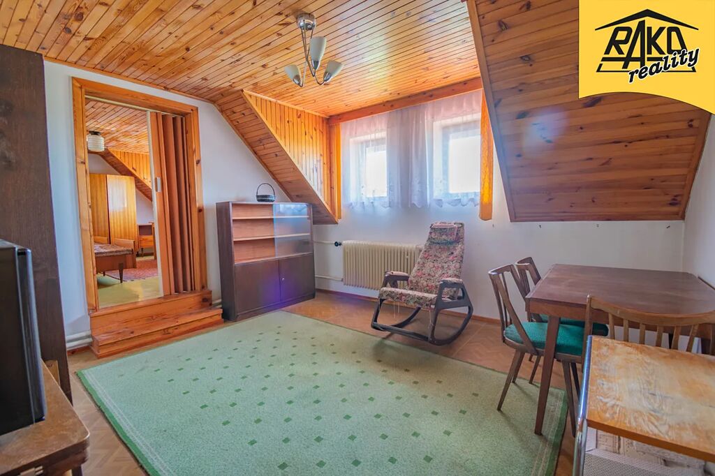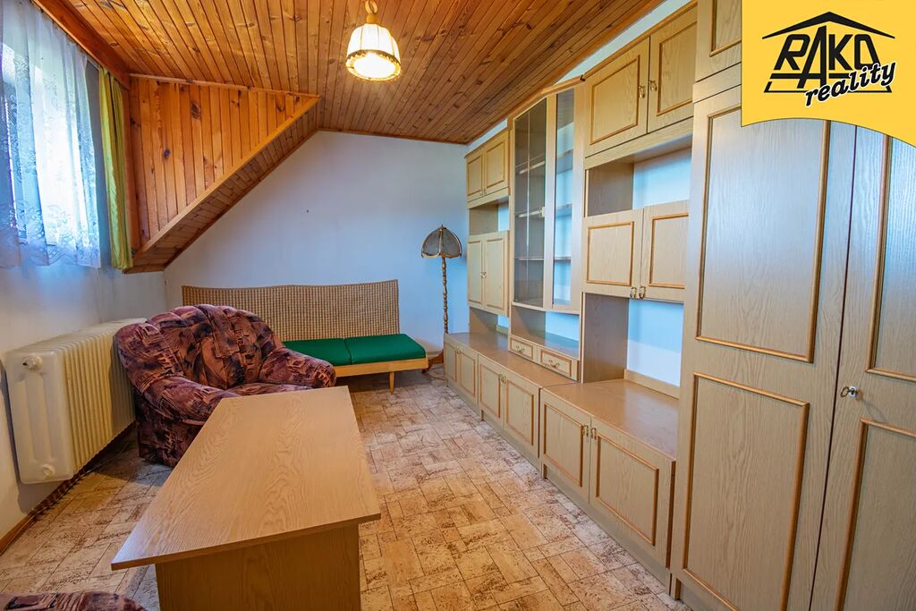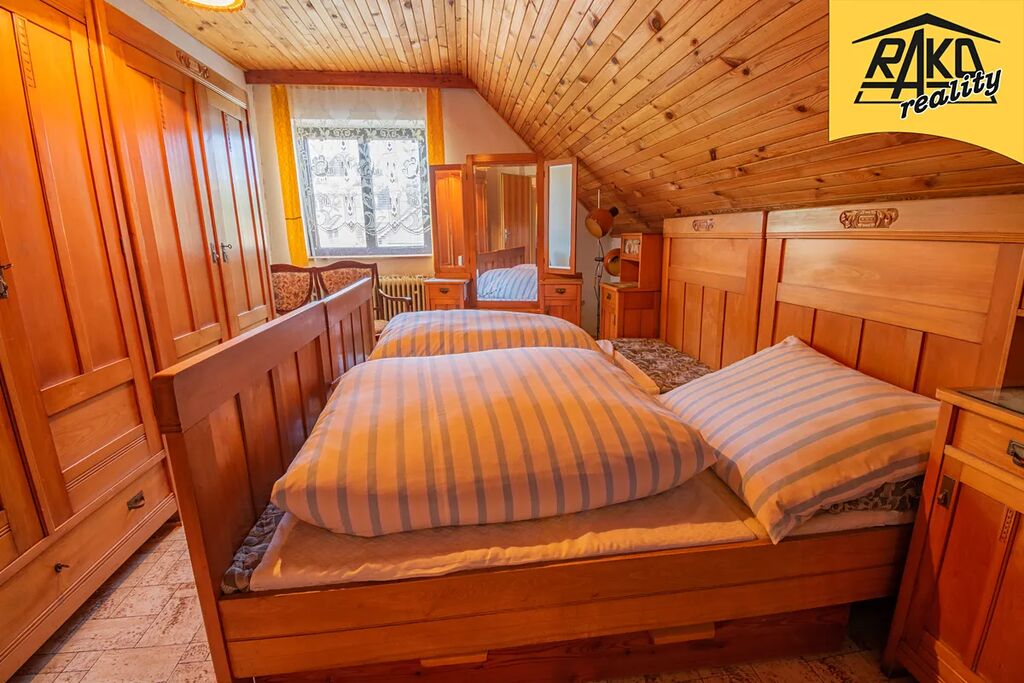 Dispozice: zádveří – vstup do domu na níž navazuje veranda ideální k posezení za deště. V prvním nadzemním podlaží vede středem domu chodba (4m2). Po levé straně je obývací kuchyň (24m2) s funkčními stylovými kachlovými kamny (vaření, vytápění) a na ní navazuje špajz (4m2). Po pravé straně je společenská krbová místnost (16m2), ze které je vstup na verandu. Středem chodby se dostaneme na samostatné WC (1,8m2) a do koupelny (7,7m2), která vyžaduje kompletní rekonstrukci. Z koupelny vedou dveře do skladu paliv (7,3m2) a následně do garáže (21,5m2). V původní části jsou stylové klenuté stropy. Do garáže je též samostatný vjezd. Do druhého nadzemního podlaží vede stylové dřevěné schodiště. Po pravé straně jsou dva samostatné pokoje (15,8m2), z čeho jeden je průchozí (15,8m2), dále je zde úložný prostor-šikmina (13m2). Po levé straně je krásná stylová ložnice (15m2) a další pokoj (15,3m2). Z podesty je vstup na lodžii. Téměř všechny obytné místnosti i schodiště jsou obložené dřevem (modřín). Jako podlahové krytiny jsou je použit beton, PVC, dlažba a teraso. Dům není podsklepený, má pouze malý sklep na potraviny a je zde umístěn vodoměr.