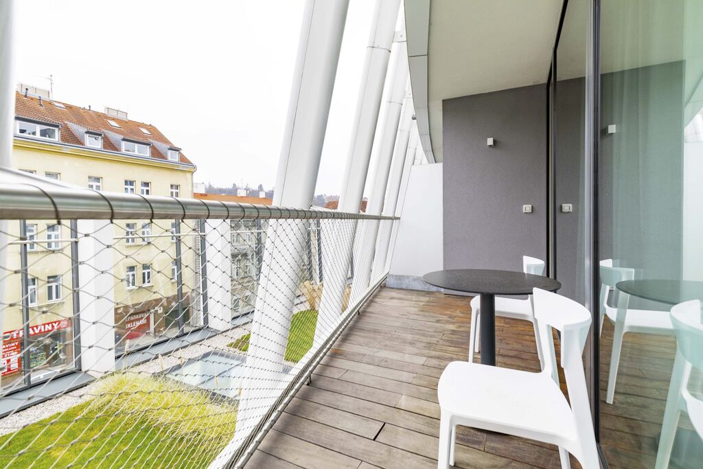 Nabízíme k pronájmu luxusní, klimatizovaný byt 2+kk s terasou ve 2. patře novostavby Rezidence Ellipsis s 24/7 recepcí, výtahem, podzemní garáží, wellness - bazén, sauna, a rozlehlou zahradou s parkovou úpravou v lokalitě Praha 5 - Smíchov s výborným spojením do centra, do nákupního centra Nový Smíchov, do Německé a Francouzské školy. Zařízený byt o velikosti 73,64 m2 nabízí vstupní halu, prostorný obývací pokoj otevřený s jídelnou a plně vybavenou kuchyní a se vstupem na terasu o velikosti 14,28 m2, ložnici, koupelnu s vanou, sprchovým koutem, bidetem a toaletou, samostatné WC a prádelnu. Kvalitní materiály, dřevěné podlahy, velkoformátová dlažba, francouzská okna, bezpečnostní dveře, internet, A/C, sklep. Možnost nájmu garážové stání za poplatek 200 EUR +21%DPH/měsíc. Oblíbená lokalita Praha 5 - Smíchov s dobrým dopravním spojením, v pěší vzdálenosti na stanici metra a tramvaje Anděl, do parku Petřínské sady. Nájem 2.200 EUR + 12% DPH splatný v EUR + členský poplatek za využití wellness 100 EUR/měsíc. Nájem zahrnuje spotřebu energií, internet a 2x měsíčně úklid. V přízemí budovy se rovněž nachází fitness centrum Prisma Institut. Byt je určen ke střednědobému pronájmu, minimální doba ubytování je jeden měsíc.