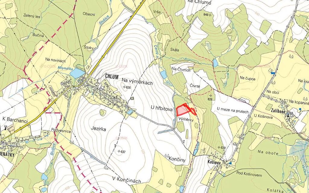 K prodeji nabízíme soubor zemědělských a ostatních pozemků ve výlučném vlastnictví, nacházejících se v katastrálním území Chlum u Hlinska, okres Chrudim. Pozemky jsou zapsané na listu vlastnictví č. 405 a tvoří je parcely č. 637 a 640.