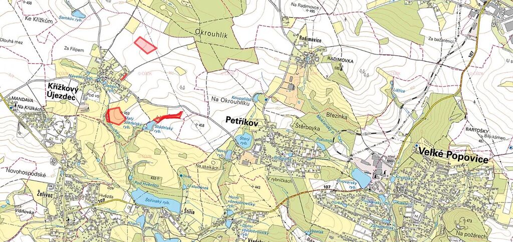 Pozemky jsou zapsané na LV 265 v KÚ Křížkový Újezdec pod parcelními čísly 830, 842, 885, 893, 922 a 923. Jejich společná výměra je 71 480 m2 a k prodeji je zde 17 870 m2 zemědělské půdy.