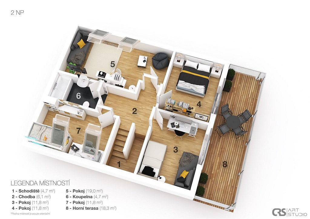 ___ Po masivních dřevěných schodech vyjdete do podkrovní haly, která nabízí vstup do čtyř pokojů a do koupelny s mohutnou rohovou vanou a WC. Tři pokoje jsou ve standardní velikosti kolem 12 m² a jeden má na podkroví úctyhodných 17 m². Ze dvou pokojů se dá vyjít prosklenými dveřmi na rozměrnou terasu (18,3 m²), s výhledem mj. i na Svatý kopeček.