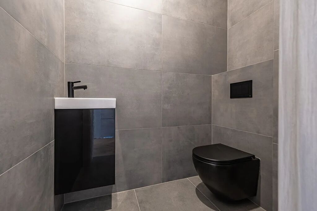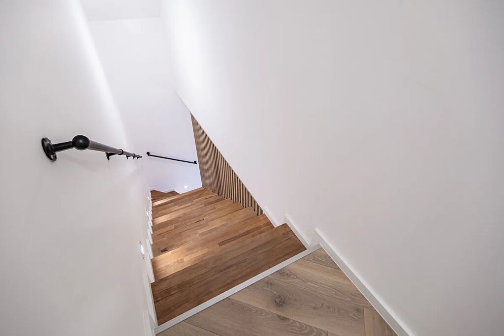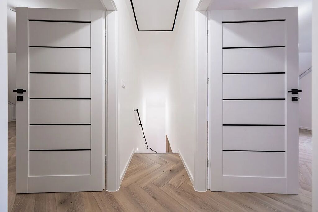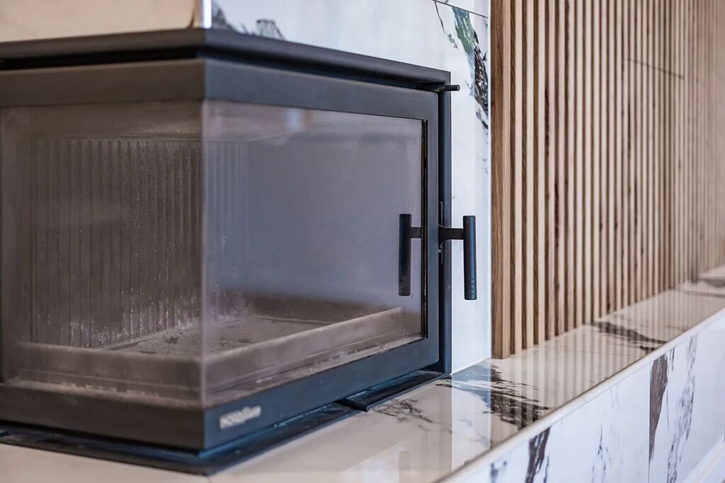Už při vstupu vás přivítá prostorná předsíň s technickou místností, odkud se otevírá průchod do velkolepého obývacího pokoje. Dominantou je mramorový krb doplněný dřevěnými lamelami, které ladí s elegantními podlahami ve vzoru rybí kosti. Otevřený prostor propojuje moderní kuchyň s jídelnou a navazuje na venkovní terasu.