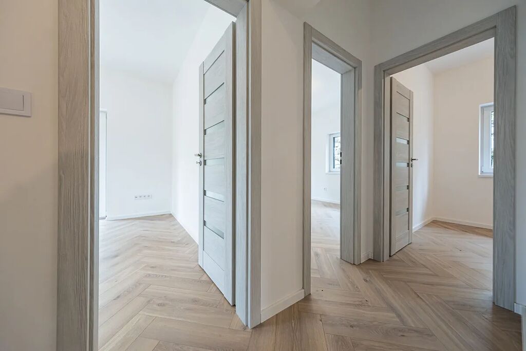 Dům nabízí také podlahové vytápění napojené na tepelné čerpadlo, plastová okna s trojskly a jednotný, příjemný design v tónu světlého dubu.
