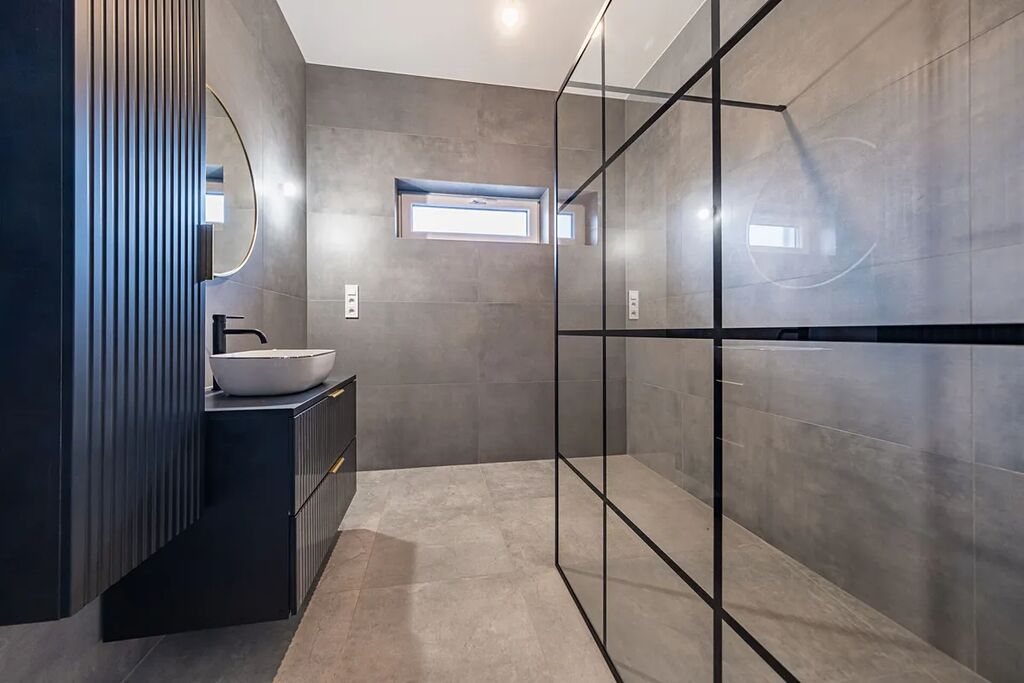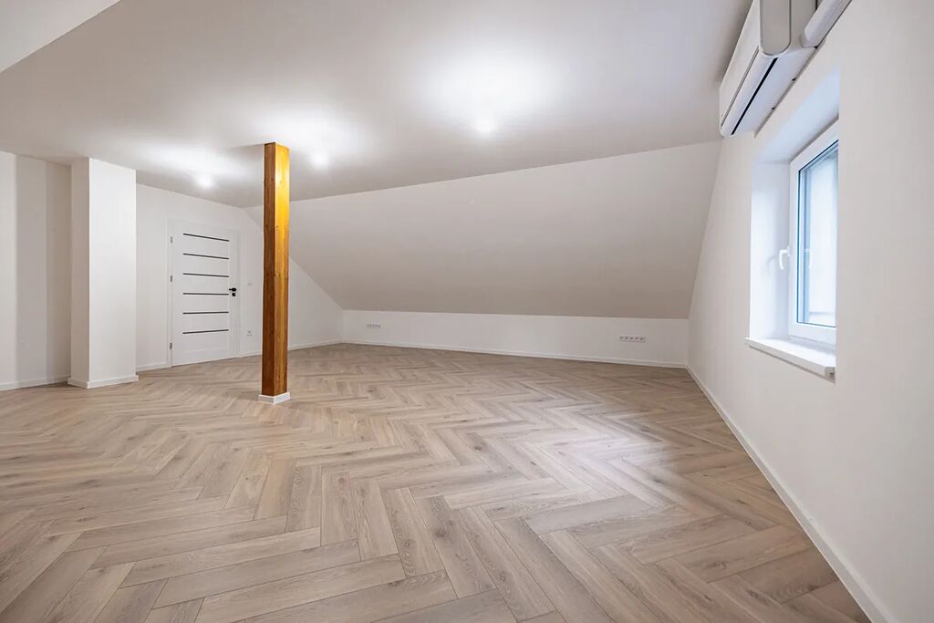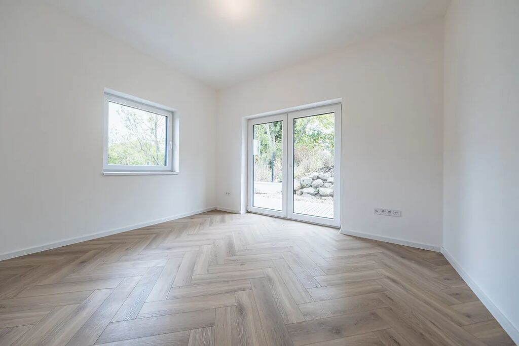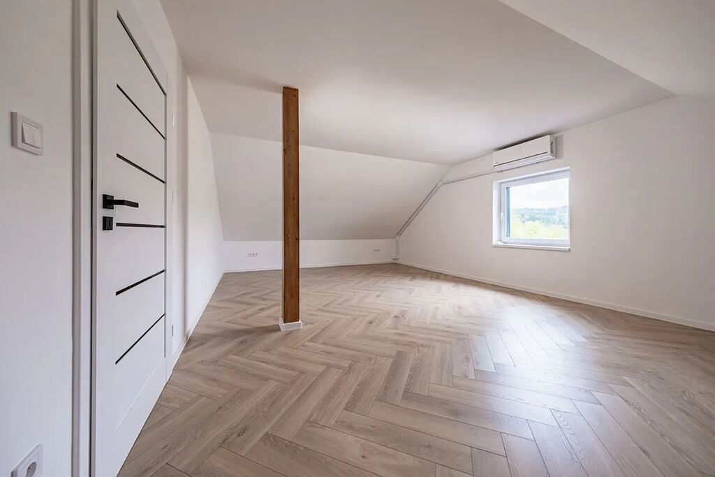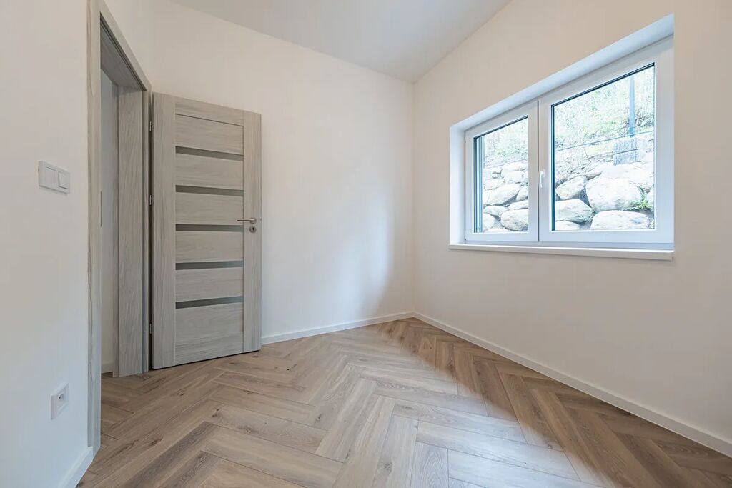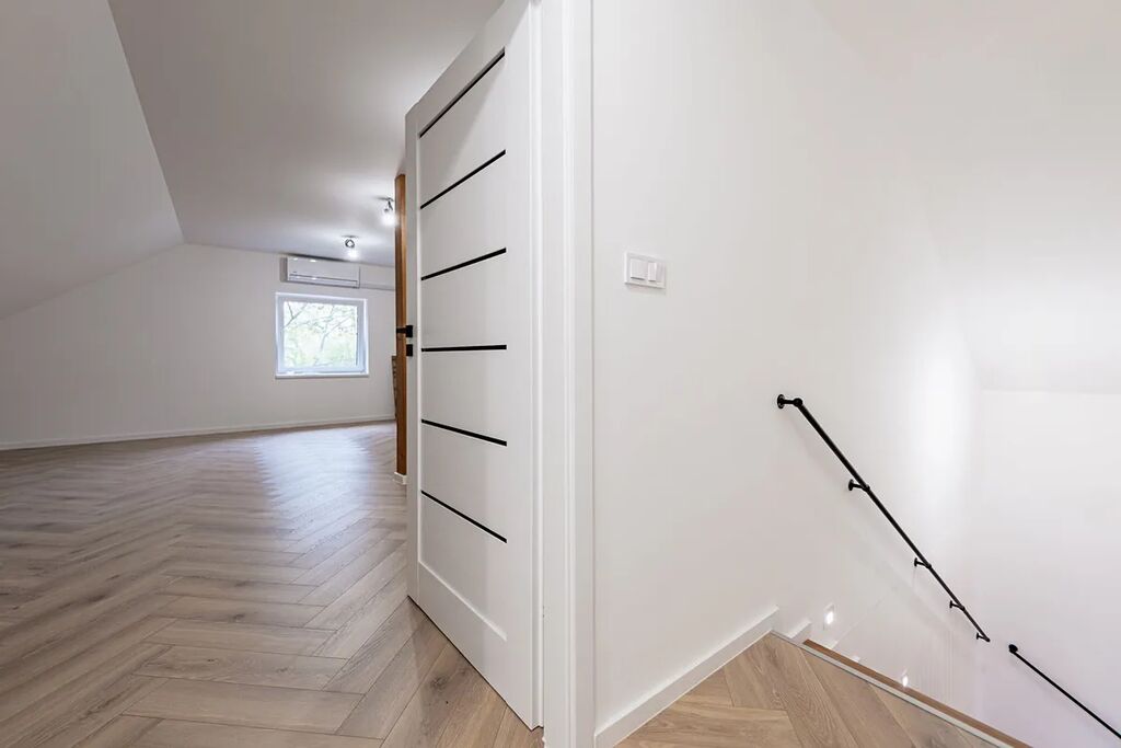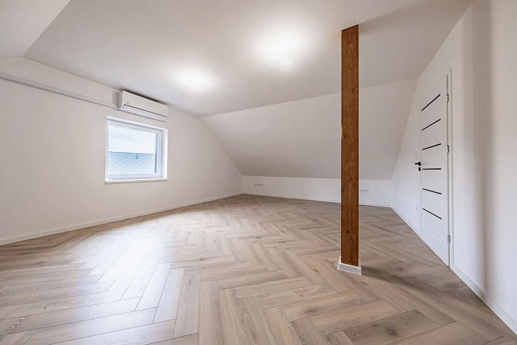 V přízemí najdete dvě ložnice, pracovnu (či pokoj pro hosty), koupelnu s walk-in sprchou a samostatnou toaletu. Z každého pokoje je vstup na terasu obklopující dům. V patře vás čekají další dvě prostorné místnosti se šikminami – ideální pro dětské pokoje, hernu, ateliér nebo šatnu snů.