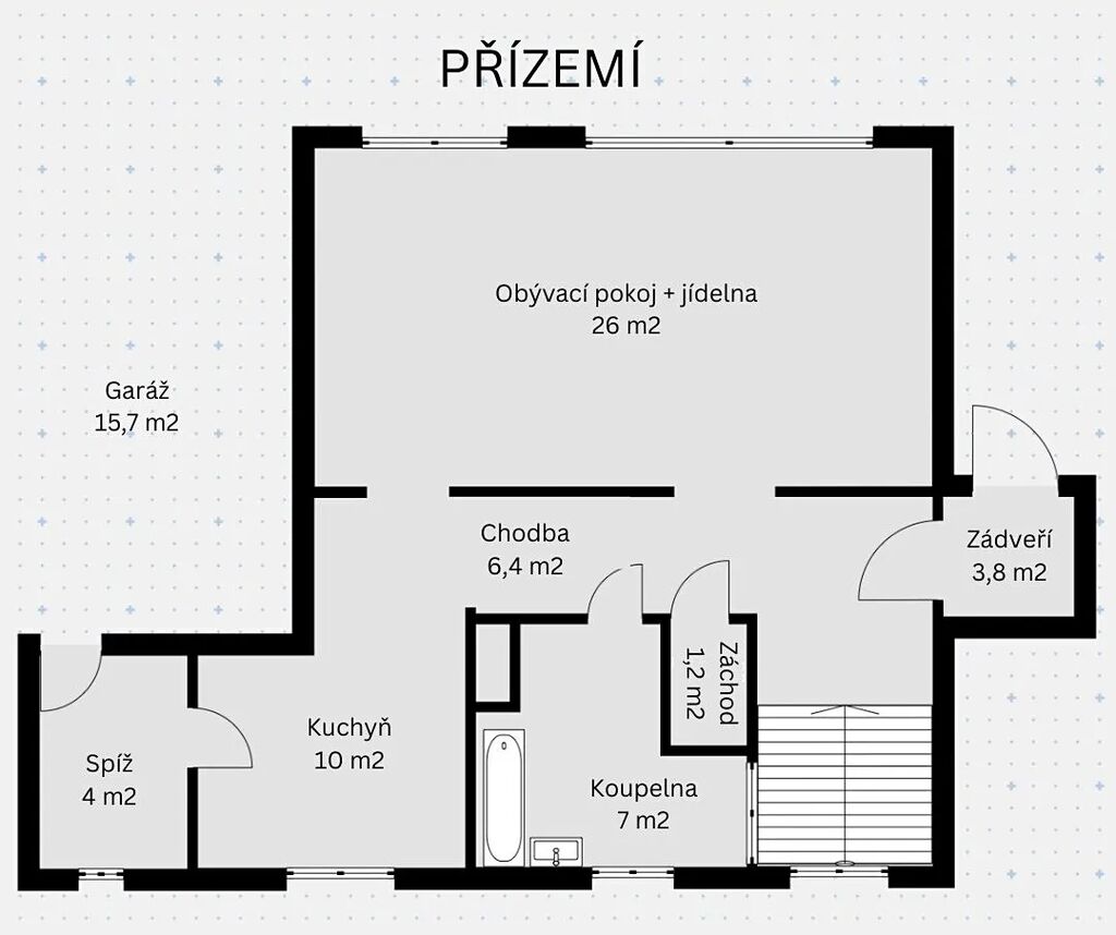 Zahrádka kolem domu je rovinatá. Parkování je možné na pozemku o velikosti 176 m2, který je součástí nabídky a nachází se přes klidnou silnici.