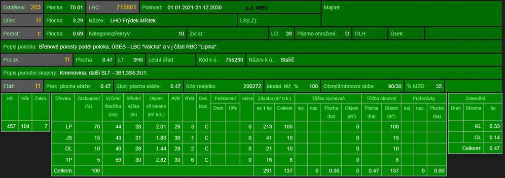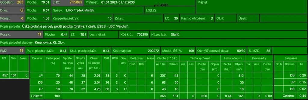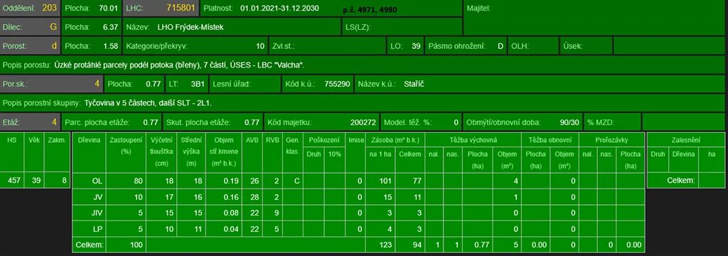 - p.č. 4971 vedená jako lesní pozemek o celkové výměře 10 889 m2, vlastníme 1/2 tedy 5 445 m2 (stáří lesa 43 let - hlavní zastoupení dřevin je olše, javor, vrba lípa),