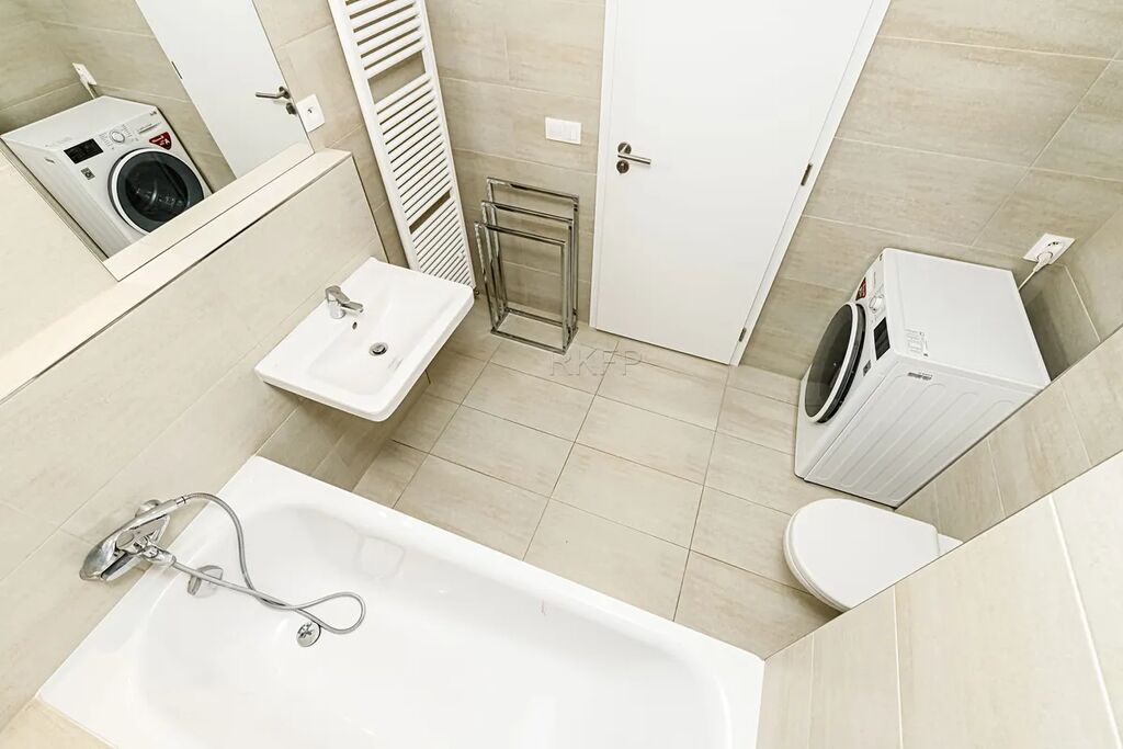Tento moderní byt sestává z pokoje s kuchyňským koutem a balkónem, koupelny s WC a předsíně. Kuchyňský kout je vybavený moderní kuchyňskou linkou s vestavěnými spotřebiči – sklokeramickou varnou deskou, elektrickou pečicí troubou, lednicí s mrazákem a nerezovou digestoří – a jídelním stolem s židlemi. V pokoji je dvojlůžko s nočními stolky, zásuvkové komody, pracovní stůl a židle. V koupelně se nachází umyvadlo, vana, WC a pračka. Díky prostorným skříním v předsíni a díky sklepu byt skýtá byt množství praktických úložných prostor.