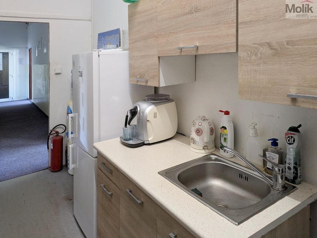 Kancelář se nachází v 1.patře ( 2.NP) a má k dispozici 2 x WC na patře (na klíč) a společnou kuchyni. Volná do týdne.