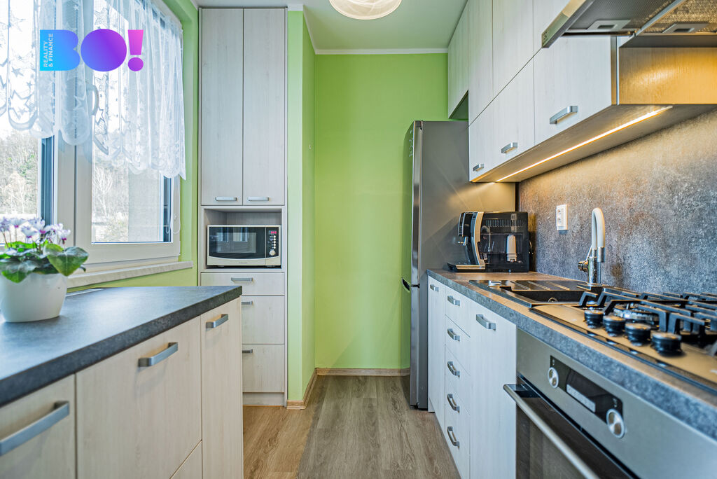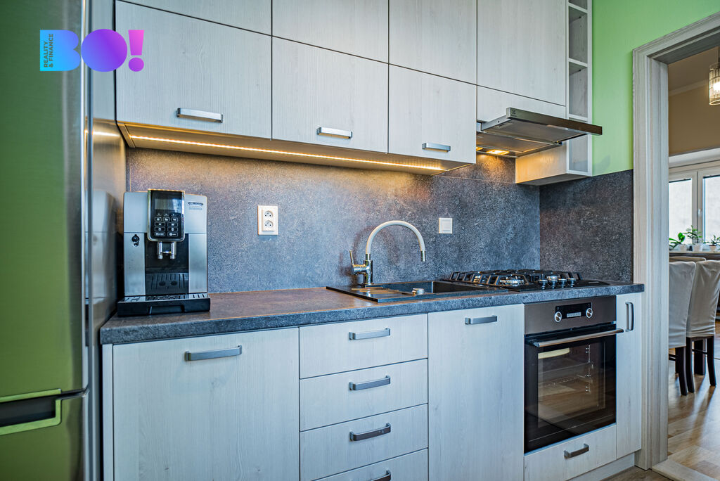 Dostatek úložného prostoru spolu s jídelním koutem dělá z bytu ideální domov pro rodinu, která hledá funkční a útulné zázemí.