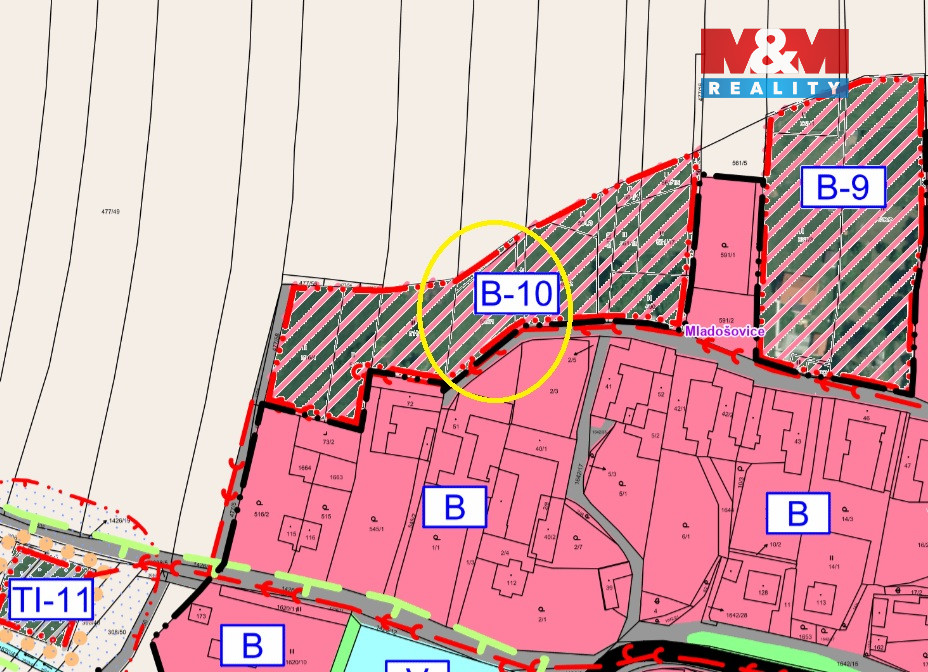 Pozemek o výměře 1 168 m² tvoří soubor tří parcel – p. č. 559/1, 561/1 a 561/7 – a je ideální volbou pro ty, kteří hledají soukromí, klid a zároveň snadnou dostupnost do Třeboně (12 min) i Českých Budějovic (20 min). V lokalitě je vedena kanalizace, ostatní inženýrské sítě jsou v dosahu. Přístup je zajištěn ze stávající místní komunikace. Dle územního plánu obce Mladošovice se pozemek nachází v ploše B-10 – plochy bydlení, kde je přípustná výstavba rodinného domu s podkrovím a doprovodných staveb, jako je garáž, pergola, zahradní domek či bazén. Regulativy výstavby dle ÚP Mladošovice – B-10:
