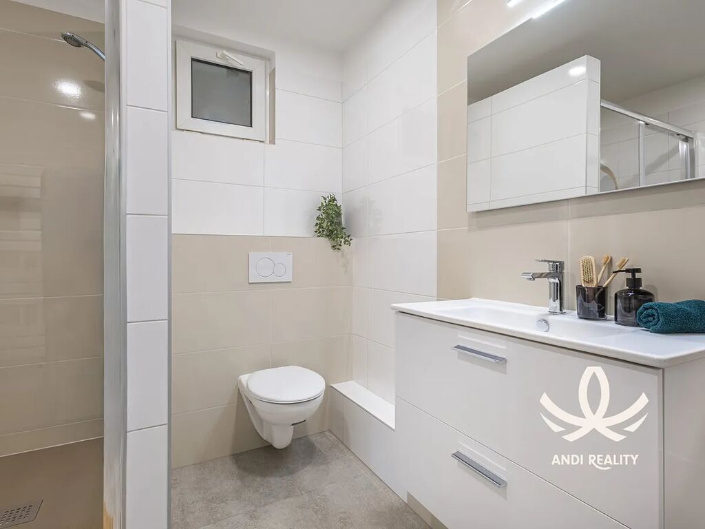 Koupelna je prostorná, moderní a promyšlená do posledního detailu. Dominantní velký sprchový kout zajišťuje komfort a zároveň přirozeně odstíní toaletu, což ocení každý, kdo preferuje větší soukromí.
