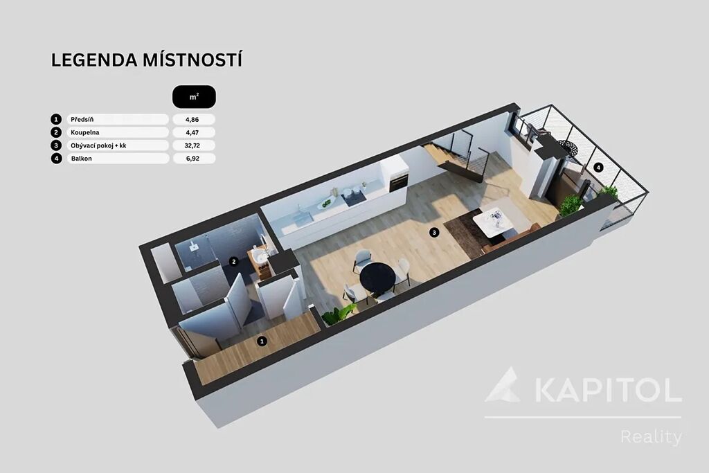 Obývací pokoj spojený s kuchyňským koutem o velikosti 32,72 m²