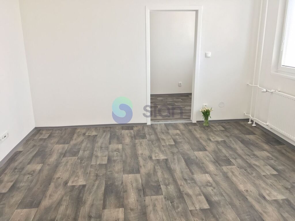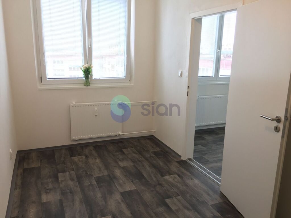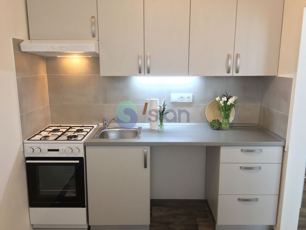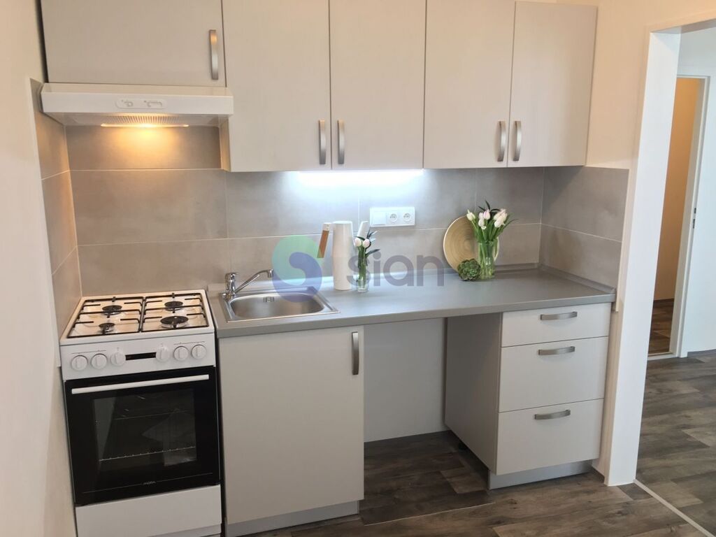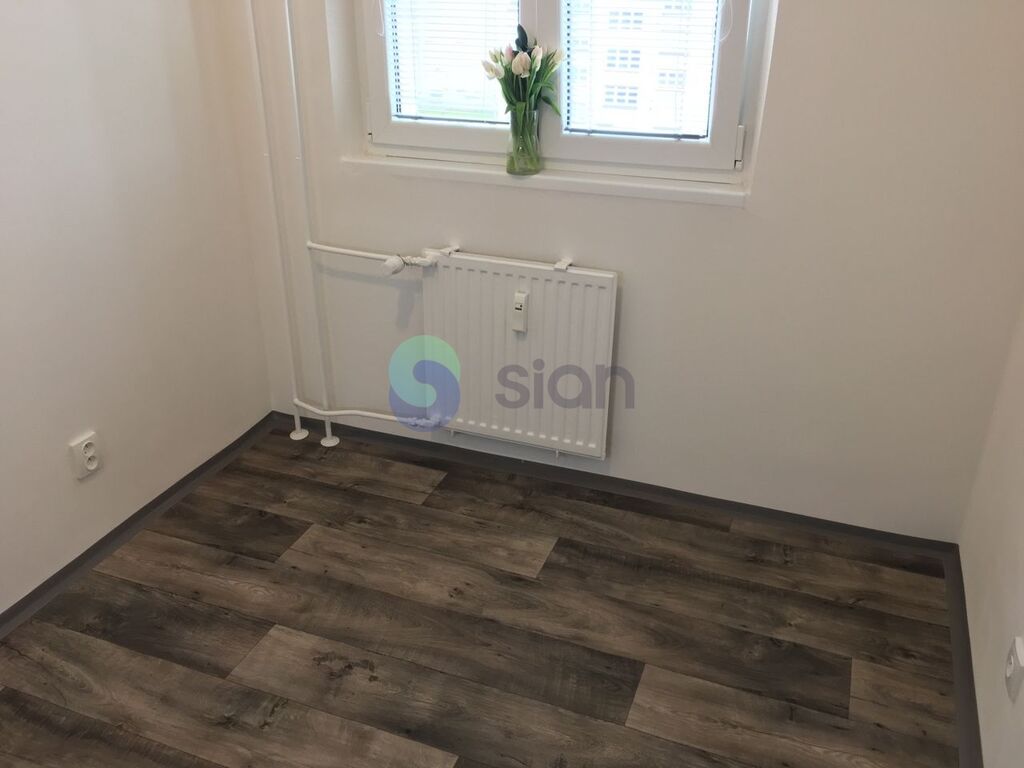 Byt je po rekonstrukci a má vyzděné jádro, podlahy, rozvody, omítky, interiérové dveře. Koupelna s vanou a umyvadlem s osvětlením, toaleta je součástí koupelny oddělená přepážkou. Kuchyňská linka je opatřena plynovým sporákem a elektrickou troubou s možností připojení pračky.