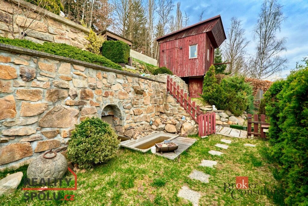Na zahrádce se nachází „srub“ s letní kuchyní krbem a posezení, které umožňuje nerušený odpočinek a relaxaci.