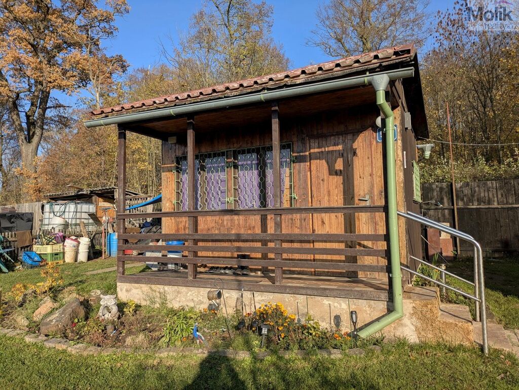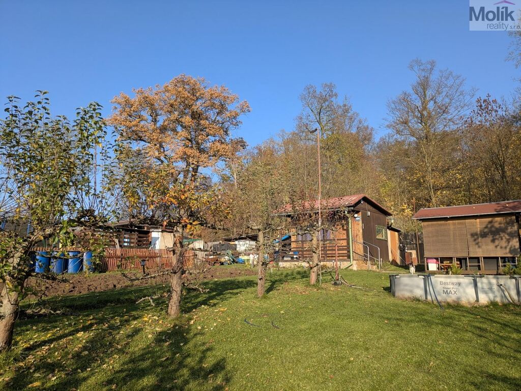 Chata stojí místě s hezkým výhledem a přímo za ní se rozprostírá les, do kterého je vstup ze zadní části zahrady. Díky menší kolonii zde najdete klid, soukromí i nezaměnitelnou atmosféru. Zahrada je udržovaná, lehce svažitá a na pozemku se nachází bazén, jabloně a pergola s posezením - ideální místo pro večery s rodinou či přáteli. (Nábytek v pergole i téměř nový plynový gril jsou součástí kupní ceny.) Příjezdová cesta je částečně zpevněná, vysypaná kamínky.