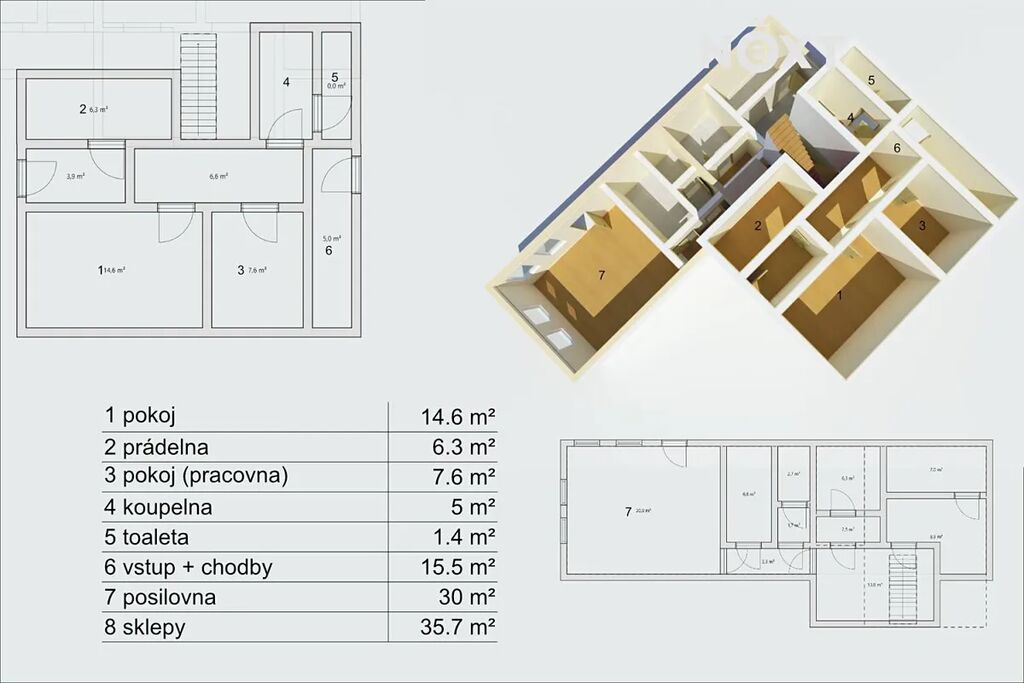Celkem 8 místností (z toho 2 menší), přes 200 m² užitné plochy a pozemek o rozloze 802 m².