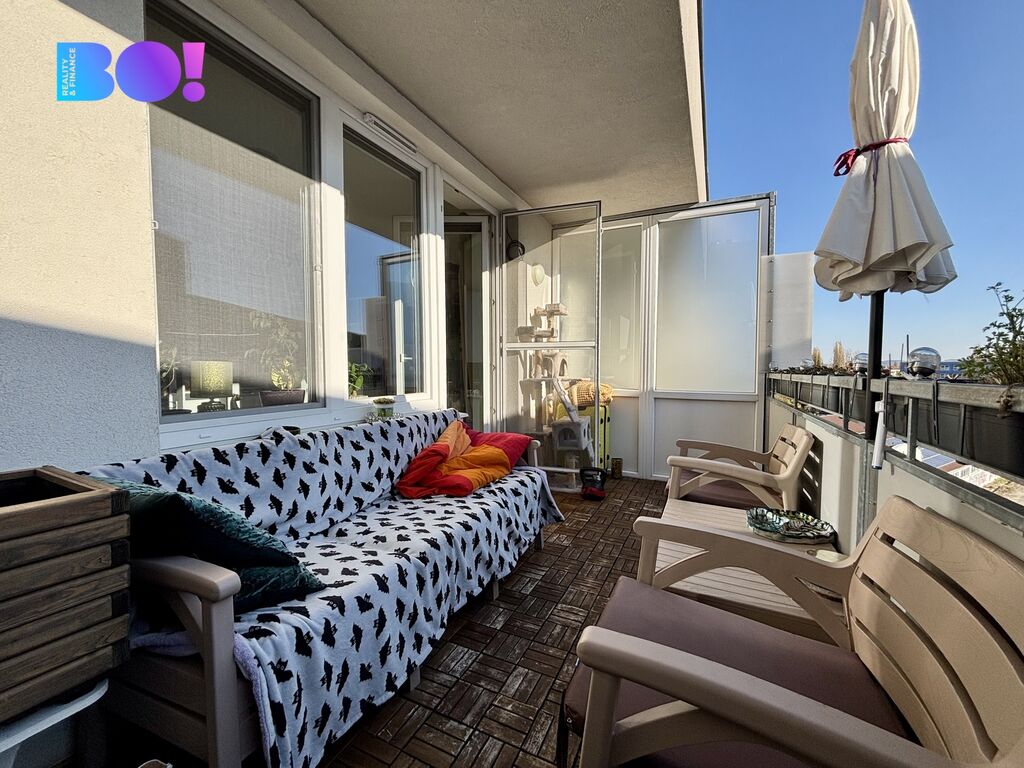 Dominantou bytu je prostorná terasa o rozloze 10 m², orientovaná do klidného vnitrobloku – ideální místo pro odpočinek a relaxaci. Byt je slunný, vybaven klimatizací a trojskly, které zajišťují komfortní teplotu a dokonalé ticho po celý rok.