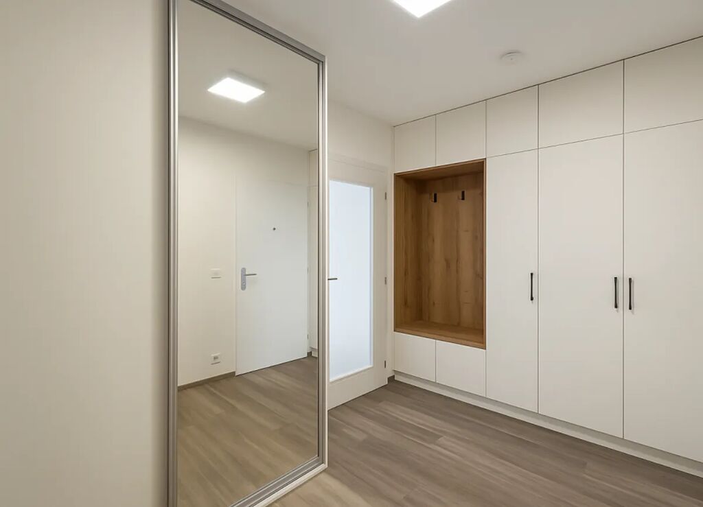 Interiér je laděn do světlých tónů a působí velmi vzdušně. Byt je vybaven kvalitní kuchyňskou linkou se spotřebiči (lednice, mrazák, trouba, indukční varná deska, myčka, digestoř), vinylovými podlahami a venkovními roletami, které zajišťují maximální komfort i soukromí.