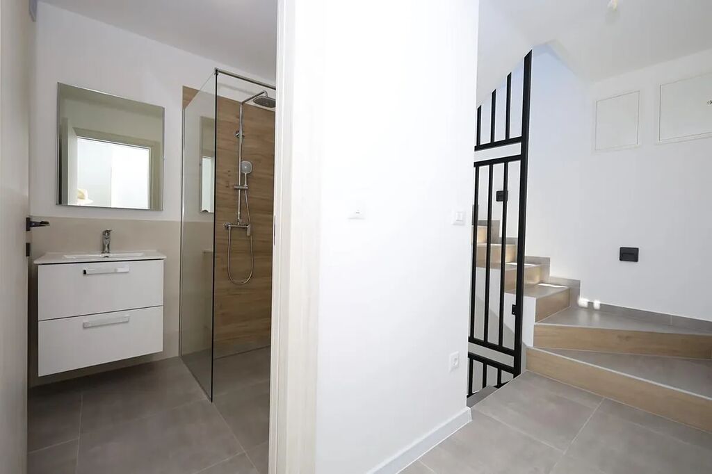 V přízemí domu je chodba, komora, 1 koupelna, velký obývací pokoj s kuchyní a jídelnou a vstup na terasu o ploše 15 m2 s přilehlým dvorkem. V 1. patře je chodba, 1 koupelna a 3 ložnice. Ve 2. patře domu naleznete střešní terasu o rozloze 24,50 m2 s výhledem na moře.