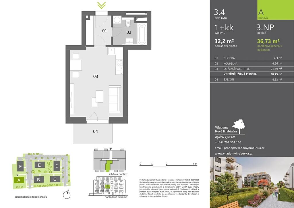Byt s označením A3.4 o dispozici 1+kk se nachází ve 3.NP pětipodlažní budovy „A“. Bytová jednotka má rozlohu 32,2 m2 k níž přísluší balkon o velikosti 4,53 m2.