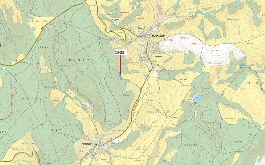 Lesní pozemek o výměře 3417 m2, parcelní číslo 1903, podíl 1/1, katastrální území Kladná Žilín, obec Luhačovice, obec s rozšířenou působností Luhačovice, okres Zlín, Zlínský kraj. Částečně po těžbě.