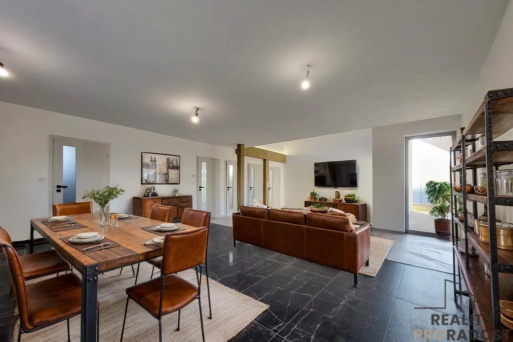 Ve výhradním zastoupení nabízím k prodeji architektonicky výjimečnou moderní novostavbu rodinného domu 5+kk o užitné ploše 246 m² na pozemku o celkové výměře 959 m², situovanou v klidné části Dobšic u Znojma na ulici Výsluní.