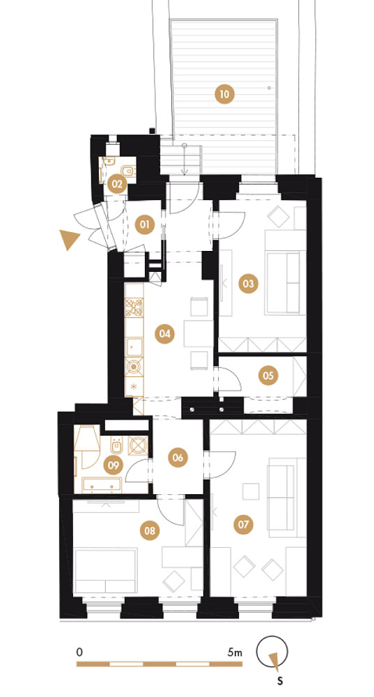 Plně vybavený byt o celkové výměře 71,86 m² a terasou 16 m². Byt má 3 neprůchozí pokoje, samostatnou šatnu a kuchyň s vestavěnými spotřebiči, koupelna se sprchovým koutem.