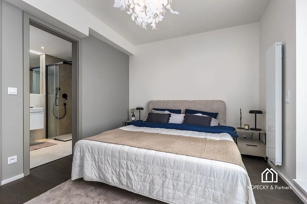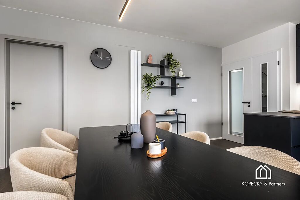 Byt o užitné ploše 115 m² je navržen tak, aby splňoval náročné požadavky na pohodlí i praktičnost. Hlavní obytnou část tvoří světlý obývací pokoj s kuchyňským koutem o rozloze téměř 30 m², který je díky velkým francouzským oknům příjemně prosvětlen a nabízí dostatek prostoru pro rodinné posezení nebo setkání s přáteli. Nechybí zde tři prostorné ložnice a další samostatná místnost, kterou lze využít jako pracovnu, dětský pokoj či pokoj pro hosty.