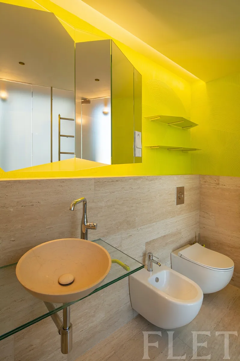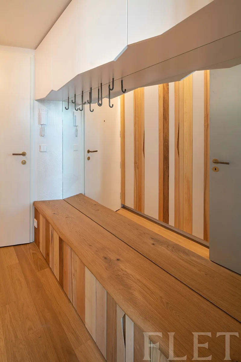 Byt je klidný a orientovaný do vnitrobloku, což zajišťuje naprosté soukromí. Interiér zaujme použitím kvalitních přírodních materiálů, dubovými podlahami, designovými prvky jako jsou kliky, svítidla či úchytky, a precizním řemeslným zpracováním. Kuchyňský kout je plně vybaven vestavěnými spotřebiči (lednice, mrazák, myčka, mikrovlnná i horkovzdušná trouba, digestoř s odvětráním) a nabízí dostatek pracovního i úložného prostoru. Praktické vestavěné skříně v chodbě a ložnici poskytují komfortní úložné zázemí. Koupelna v kamenném obkladu Travertin působí luxusně a nabízí vanu, bidet, podlahové topení i topný žebřík na ručníky. Samozřejmostí jsou bezpečnostní dveře, datové zásuvky a výkonný větrací systém pro maximální komfort.